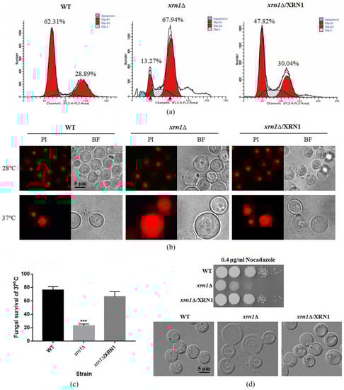 In addition, after staining with PI, the aggregated fluorescent was observed in the WT, xrn1∆ and complementation strains cultured at 28 °C. However, the xrn1∆ mutant showed massively enlarged PI stained nuclei after incubation at 37 °C for 60 h. More than half of the xrn1∆ mutant cells exhibited this phenotype. We speculate that a large amount of DNA flowed into the cytoplasm in the xrn1∆ strain, so the entire cell was full of fluorescence. The nucleus of WT and complementation strains were still in a nucleation at 37 °C (Figure 4b). At the same time, we determined yeast survival rate and found that the Xrn1-deficient strain died in large numbers, and only 23% of the mutant cells survived, while the survival rates of the WT and complementation strains were 76% and 66%, respectively (Figure 4c). These phenomena indicate that the enlargement of the cells caused by XRN1 deletion affected the cell cycle progression, blocking the cell cycle in the G2/M phase and resulting in slow growth or even death.