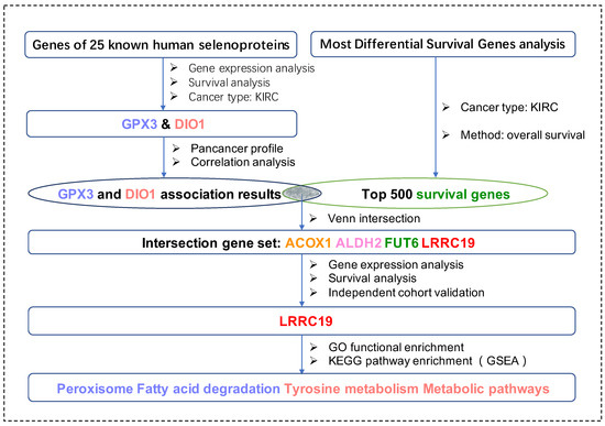 For the first time in this current work, we applied bioinformatic methods on KIRCs and normal cases from the TCGA database and GTEx database with the aim to identify key genes (DIO1 and GPX3) from the total 25 selenoproteins. We took advantage of survival maps to investigate prognostic selenoproteins with significant survival probability in KIRC and selected the ones with differential expression between KIRCs and normal cases. Moreover, we matched DIO1 and GPX3 associated genes with the most common survival genes of KIRC. The four matched most common survival genes, namely leucine-rich repeat-containing protein 19 (LRRC19), aldehyde dehydrogenase 2 family member (ALDH2), fucosyltransferase 6 (FUT6), and acyl-CoA oxidase 1 (ACOX1), were further screened in the KIRC dataset with both differential expression and survival curves, and only LRRC19 were screened out. Enrichment analysis of LRRC19 showed potential mechanisms of its correlations to GPX3 and DIO1. Importantly, we validated such correlation in two independent KIRC cohorts available from the GEO database. In particular, this protocol is universal with all TCGA cancer types, suited for cancer research of selenium. Figure 1 shows the workflow of our study.