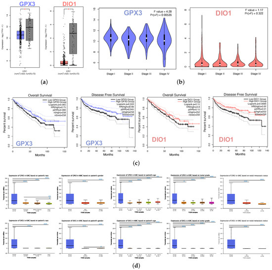 The box plot indicated the lower expression levels of GPX3 and DIO1 in KIRC cases than normal cases (Figure 2a). We also analyzed the expression of GPX3 and DIO1 with the KIRC tumor stage. GPX3 was significantly downregulated in Stage IV, whereas DIO1 did not significantly vary (Figure 2b). We further explored the critical efficiency of GPX3 and DIO1 in the survival of KIRC cases by Kaplan–Meier plots (K-M plots). Survival curves were performed to analyze the association between the mRNA expression and the survival probability of KIRC patients. The survival curve and log-rank test analyses revealed that the decreased GPX3 (p < 0.05) and DIO1 (p < 0.01) levels were significantly correlated with the disease-free survival (DFS); however, the overall survival (OS) showed no significance (Figure 2c). The KIRC patients with higher mRNA levels of GPX3 and DIO1 were predicted to have good prognoses.