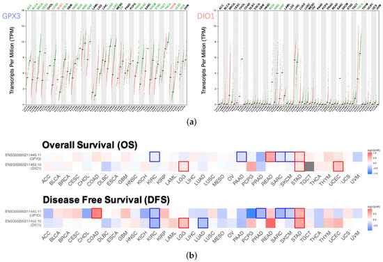 Expression level and survival analysis of GPX3 and DIO1 across 33 TCGA cancer types (GEPIA2). (a) Dot plots of GPX3 and DIO1 differential expression levels in 33 cancer types (TCGA) compared to the normal (TCGA normal and GTEx). Each dot represents a distinct tumor (pink) or normal sample (green). The abscissa represents the sample from tumor tissue (T) or normal tissue (N), and “n” represents the sample size. The ordinate represents the amount of transcript expression in the sample, and the expression data were transformed. Above the table are the TCGA abbreviations of the cancer names. The cancer name coding in green indicates that the target gene has relatively lower expression in the tumor tissue, and the red indicates higher expression. We selected LIMMA as the differential method. || > 1 and FDR < 0.01 were considered as differentially expressed. (b) Heat map of hazard ratios (HR) illustrating cancer-GPX3/DIO1 pairs with altered prognosis. We selected the median as the suitable expression threshold for splitting the high-expression and low-expression cohorts. The hazards ratio (HR) was calculated based on the Cox PH Model, and the HR value was scaled in decibel (dB). The red and blue color presented high and low risk, respectively, and the intensity of color indicated the value of HR. The bounding box around the tiles represented the statistically significant cancer types (p < 0.05). Adrenocortical Carcinoma (ACC), Bladder Urothelial Carcinoma (BLCA), Breast Invasive Carcinoma (BRCA), Cervical Squamous Cell Carcinoma and Endocervical Adenocarcinoma (CESC), Cholangiocarcinoma (CHOL), Colon Adenocarcinoma (COAD), Lymphoid Neoplasm Diffuse Large B-cell Lymphoma (DLBC), Esophageal Carcinoma (ESCA), Head and Neck Squamous Cell Carcinoma (HNSC), Kidney Chromophobe (KICH), Kidney Renal Clear Cell Carcinoma (KIRC), Kidney Renal Papillary Cell Carcinoma (KIRP), Acute Myeloid Leukemia (LAML), Brain Lower Grade Glioma (LGG), Liver Hepatocellular Carcinoma (LIHC), Lung Adenocarcinoma (LUAD), Lung Squamous Cell Carcinoma (LUSC), Mesothelioma (MESO), Ovarian Serous Cystadenocarcinoma (OV), Pancreatic Adenocarcinoma (PAAD), Pheochromocytoma and Paraganglioma (PCPG), Prostate Adenocarcinoma (PRAD), Rectum Adenocarcinoma (READ), Sarcoma (SARC), Skin Cutaneous Melanoma (SKCM), Stomach Adenocarcinoma (STAD), Testicular Germ Cell Tumors (TGCT), Thyroid carcinoma (THCA), Thymoma (THYM), Uterine Corpus Endometrial Carcinoma (UCEC), Uterine Carcinosarcoma (UCS), Uveal Melanoma (UVM).