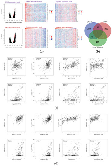 The LinkFinder module of LinkedOmics was used to perform association genes of GPX3 and DIO1 based on the data of 533 KIRC patients. The platform was selected as HiSeq RNA in both the Search dataset and the Target dataset (28 January 2016). The data were normalized by the RNA-seq by expectation maximization (RSEM) pipeline. In the correlation analysis, p-value and coefficient were obtained from the statistical method of Pearson, which stood for the statistical significance and the degree of correlation, respectively. Since the results of the correlation analysis should consider both the significance and the value of the correlation coefficient, volcano plots (Figure 4a) were generated to overview the correlation analysis results, wherein each dot represents a gene. Overall, 651 genes (red dots) showed strong positive correlations with GPX3, whereas 282 genes (green) showed strong negative correlations; and 282 genes (red dots) showed strong positive correlations with DIO1, whereas 44 genes (green) showed strong negative correlations (FDR < 0.01, Pearson correlation coefficient R > 0.3). As shown in the volcano plots, GPX3 and DIO1 had more positive correlation genes than the negative ones. The individual genes of interest can be queried in Table S1. The top-rank significant genes positively and negatively associated with GPX3 and DIO1 are shown in the heat maps of Figure 4a, respectively. This results indicate a widespread impact of selenoproteins GPX3 and DIO1 at the transcriptome level.