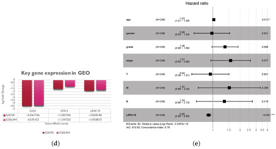 Screen and validation of intersection genes. (a) Validation of ACOX1, ALDH2, FUT6, and LRRC19 differential expression in KICR on GEPIA2. Box plots show that there was a significant differential expression of LRRC19 between KIRC cases and normal cases (|| > 1 and p < 0.05). (b) Stage plots of intersection genes expression with tumor stage in KICR on GEPIA2. Violin plots show ACOX1, FUT6, and LRRC19 were significantly downregulated in Stage IV (p < 0.001). (c) Kaplan–Meier plots show the prognostic value of ACOX1, ALDH2, FUT6, and LRRC19. Overall and disease-free survival curves were generated for the comparison of survival percent between groups with high and low gene expression (p < 0.01 in Log-rank test). (d) Validation of DIO1, GPX3, and LRRC19 expression fold change in independent GEO cohorts, GSE781 and GSE6344. (e) Multivariate analysis of the correlation of LRRC19 expression with OS among KIRC patients. The columns in the forest plot are parameter, number of patients, HR (IC 95%), and p value. (* p < 0.05, ** p < 0.01, *** p < 0.001).