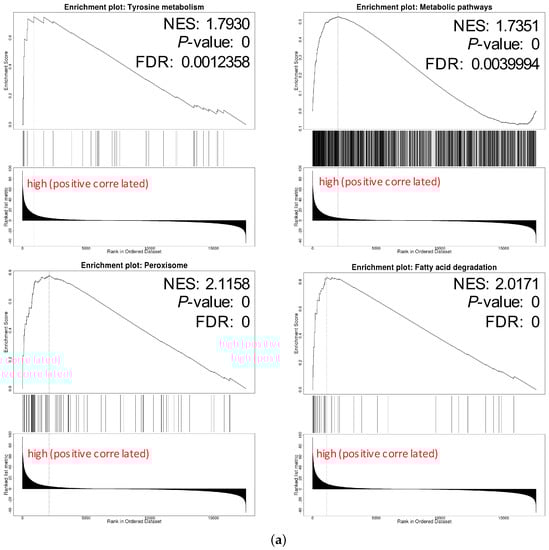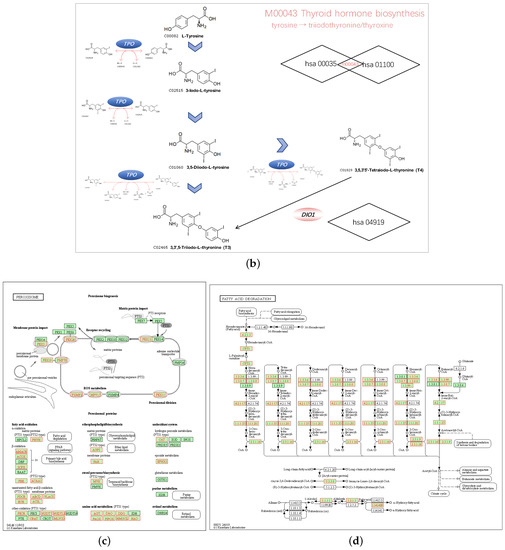 We chose hsa04146 Peroxisome and hsa00071 Fatty acid degradation for their highest normalized enrichment score (NES) and FDR value. They also represented the potential to correlate to the biological progress of GPX3, compared with the KEGG pathway term of the Ribosome. The hsa00035 Tyrosine metabolism and hsa01100 Metabolic pathways were also selected as the interesting terms and the GSEA results are shown in detail in Figure 7a. Tyrosine metabolism and Metabolic pathways were closely associated with the function of thyroid hormones regulated by DIO1. In the results of the enrichment analysis, hsa00035 Tyrosine metabolism and hsa01100 Metabolic pathways had high NES scores, which were 1.7930 and 1.7351, respectively. Among them, Module 00043 Thyroid hormone biosynthesis was the intersection of these two pathways, which represents the transformation process of tyrosine to triiodothyronine (T3)/thyroxine (T4). Referring to hsa04919 Thyroid hormone signaling pathway, we determined the relationship between DIO1 and M00043 (Figure 7b). Peroxisome (Figure 7c) and Fatty acid degradation (Figure 7d) were the top two terms ranked with the normalized enrichment score (NES).
