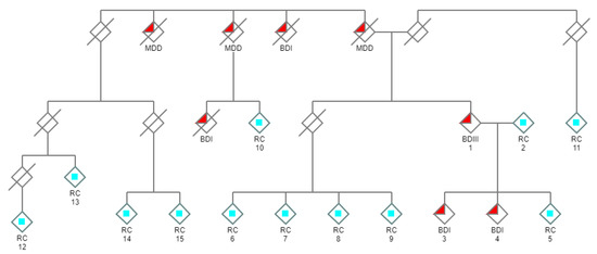 Both BDI siblings have a decades-long psychiatric history and have experienced multiple manic episodes, with psychotic features, and depressive episodes satisfying the DSM-5 (Diagnostic and Statistical Manual of Mental Disorders—Fifth Edition) criteria for BDI. It is known that there is a high risk of psychiatric disorders among the relatives of patients with BDI and MDD [16,17]. Thus, we did not discriminate among different psychiatric diagnoses in the extended family as the family pedigree historically includes individuals diagnosed with BDI, MDD, or BDIII (Figure 1). Apart from the three affected subjects, there were no other living individuals with a psychiatric diagnosis in the extended family. Genomic data from twelve related controls, and one unrelated control, were also used to filter variants to assist in the discovery of the novel cosegregating DCTN1 splice site variant described in this research.