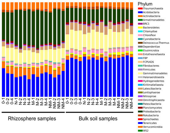 The sequences were produced in two different sequencing runs and were subsequently merged for the analysis. In total, 6,315,452 raw sequences were processed. After length/quality filtering and removal of chimera and contaminant sequences, 1,326,174 high-quality bacterial reads remained, which were grouped into Operational taxonomic units (OTUs) at 97% similarity level. Three thousand and fifteen OTUs had more than 10 reads and were kept for the analysis. Thirty-three prokaryotic (32 bacterial and one archaeal) phyla, 91 classes, 234 orders, 392 families, and 677 genera were identified. In rhizospheric soil, the most abundant phylum was Proteobacteria, while in the bulk soil Acidobacteria had the highest relative abundance (Figure 1). One rhizosphere sample of the treatment “0” (0–3) was removed, because it had an unreliable taxonomical composition dominated by one single OTU, and was not included into the dataset (Figure S1).