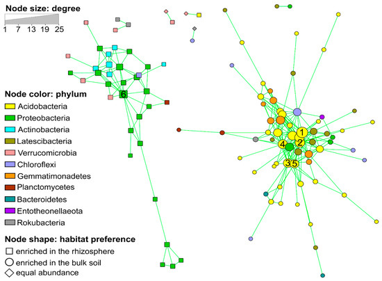 Co-occurrence network showing the positive correlations (FDR-corrected p < 0.05) between abundant Operational taxonomic units (OTUs) (> 0.075% of total reads) in the rhizosphere and bulk soil habitats. Circles represent OTUs, colored by taxonomy and sized by degree (number of connections). Node shapes indicate the habitat preference. Numbers indicate the hub OTUs: 1) OTU 14-Acidobacteria (Subgroup 6); 2) OTU 15-Acidobacteria (Subgroup 11); 3) OTU 28-Acidobacteria (Subgroup 6); 4) OTU 51-Acidobacteria (Subgroup 5); 5) OTU 74-Acidobacteria (Subgroup 22) and 6) OTU 22-Betaproteobacteriales (SC-I-84).