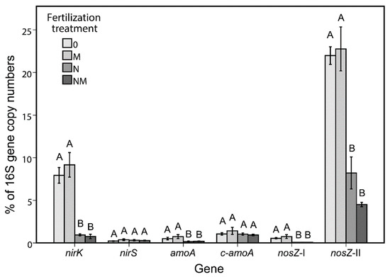 Relative abundance (% of 16S rRNA gene copy number) of nitrogen cycle-related genes (bacterial amoA, archaeal amoA, nirK, nirS nosZ-I and nosZ-II) in the bulk soil under the four N-fertilization treatments. Different letters above the bars indicate significantly different means (Tukey HSD, p < 0.05) among each gene. Treatments: 0, no N-amendment; N, mineral-N amendment; M, manure amendment; NM, mineral-N + manure amendment.
