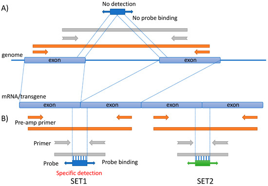 Probe and primer design for microfluidic quantitative PCR (MFQPCR) detection. Two assays (SET1 and SET2) were designed for each transgene. Forward and reverse primers for MFQPCR were designed to target different exons. TaqMan probe for MFQPCR was designed to target exon/exon junctions. Forward and reverse primers for pre-amplification were designed to include the forward and reverse primers for MFQPCR. While forward and reverse primers for pre-amplification and MFQPCR may amplify PCR products, including genomic DNA regions, TaqMan probes do not anneal to the PCR product, including genomic DNA regions (A). TaqMan probes specifically anneal to PCR products having exon/exon junction sequences (B).