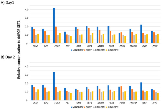 However, relative values obtained by NanoDrop OneC ranged from 1.24 (PDK4) to 4.17 (FGF2) on Day1 and 1.33 (ZFAT) to 3.35 (FGF2) on Day2. Relative values obtained via Qubit dsDNA HS Assay ranged from 1.24 (PDK4) to 1.97 (FGF2) on Day1 and 1.12 (FST) to 1.68 (PDK4) on Day2. Concentrations obtained by NanoDrop OneC and Qubit dsDNA HS Assay were higher than those obtained via ddPCR.