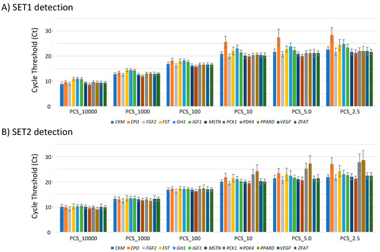 Cycle threshold (Ct) of each transgene on positive control sample (PCS)_10000 (12,500 copies), PCS_1000 (1250 copies), PCS_100 (125 copies), PCS_10 (12.5 copies), PCS_5.0 (6.25 copies) and PCS_2.5 (3.125 copies) based on SET1 (A) and SET2 (B) detections. The experiment was repeated 35 times, and the mean values are shown.