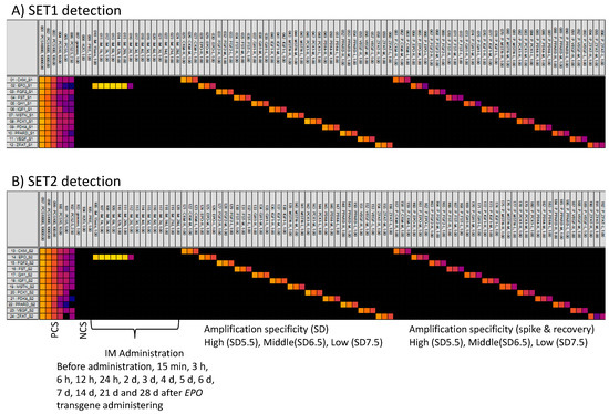 Image of microfluidic quantitative PCR (MFQPCR) detection. Positive control samples (PCS_10000, PCS_1000, PCS_100, PCS_10, PCS_5.0 and PCS_2.5); negative control samples (horse genomic DNA and Milli-Q) and plasma at: before administration, 15 min, 3 h, 6 h, 12 h, 24 h, 2 d, 3 d, 4 d, 5 d, 6 d, 7 d, 14 d, 21 d and 28 d after EPO transgene administering high, middle and low concentration of PCSs for each transgene, and spiked and recovered samples for each transgene were MFQPCR-amplified using SET1 (A) and SET2 (B) detections. Vertical axis is assays; CKM, EPO, FGF2, FST, GH1, IGF1, MSTN, PCK1, PDK4, PPARD, VEGF and ZFAT for SET1 (A) and SET2 (B) detections. Light yellow and orange indicate lower cycle thresholds (Cts) (high copy concentrations). Dark purple depicts high Cts (low copy concentrations). Black indicates nonamplification. NCS: negative control sample.