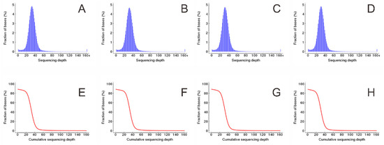 Coverage depth of reference contributed by clean reads. (A–D) Distribution of coverage depth of reference contributed by KF, K21, K5, and KM, respectively, and (E–H) cumulative distribution of coverage depth of reference contributed by KF, K21, K5, and KM, respectively.