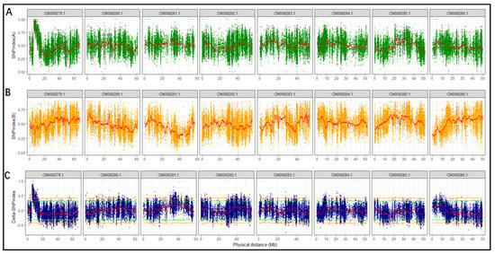 SNP-index plot: (A) the top panel is the plot of SNP-index for K21; (B) the middle panel is the plot of SNP-index for K5; (C) the bottom panel is the plot of delta SNP-index displaying the difference between A (top panel) and B (middle panel). The green and yellow horizontal lines represent thresholds for 95% and 99% confidence intervals, respectively.