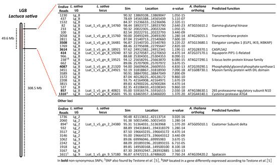 One of the major results of this work is that among the 50 SNP markers that were able to fully discriminate curly and escarole endive, 24 of them mapped within a peripheral segment of chromosome 8 of L. sativa, spanning a DNA region of 49.6 Mb. Moreover, six of them carried nonsynonymous SNVs (3508, 3614, 414, 4087, 857, and 1310, Figure 3). This finding is extremely meaningful if we consider that nearly half (24/50) of the discriminating SNPs fall in a genomic window (49.6 Mb) that represents less than 2.1% of the entire lettuce genome (2.22 Gb, [55]).
