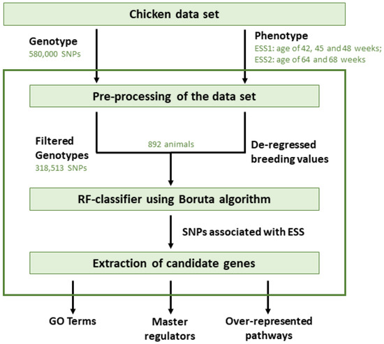 To overcome these limitations of GWAS, application of Bayesian frameworks as well as machine learning algorithms have gained importance in the last decade [21,22,23,24,25]. Their comparative performance has been evaluated for a variety of traits with different genetic architectures (see the reviews [13,26,27]). Nevertheless, multiple studies have revealed that machine learning algorithms surpass currently available well-known GWAS approaches in identifying genes having small effects on the phenotype [28,29,30]. In particular, Brieuc et al. pointed out the efficiency of Random Forests (RF) models for analyzing a large number of loci simultaneously and identifying promising associations [28]. Inspired by Brieuc et al.’s study, we applied the RF algorithm to assess the importance of SNPs that could provide a clue of their essential roles for ESS and to characterize the differences observed in this trait at different time points. For the analysis of the corresponding genes of these SNPs, we adopted a well established systems biology approach and identified age-specific and common key regulatory pathways and master regulators. These findings could: (i) enhance our understanding of the regulatory mechanisms underlying eggshell strength; and (ii) provide novel targets and hypotheses for future breeding strategies. To the best of our knowledge, it is the first study in this field which mainly focuses on the importance of the age-specific and common key regulatory mechanisms in chicken to reveal the genetic programs influencing the eggshell strength.