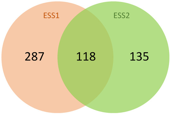 Venn diagram depicting the number of genes associated with eggshell strength at Time Point 1 (ESS1), at Time Point 2 (ESS2), and their overlap.