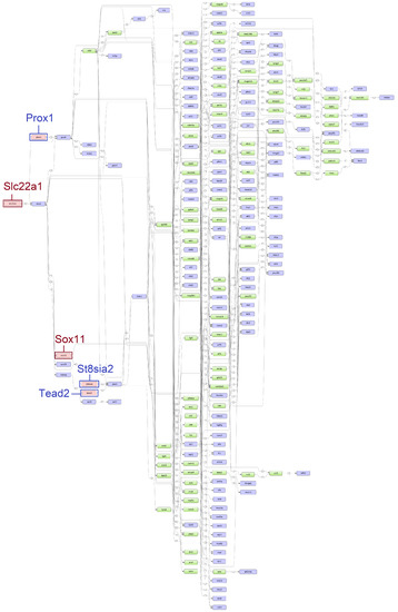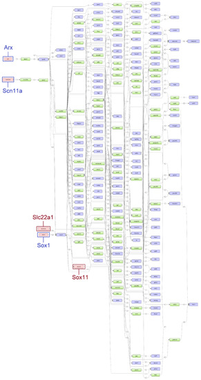 Applying the “upstream analysis” integrated in the geneXplain platform [41], we identified the top five age-specific and common master regulators. While the master regulators Arx, Sox1, and Scn11a were specifically found for ESS1, the master regulators St8sia2, Tead2, and Prox1 were identified for ESS2. Additionally, Slc22a1 and Sox11 were identified for both time points (see Figure 5 and Figure 6).