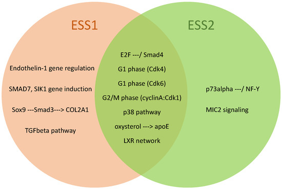 To further elucidate and investigate the mechanisms that control the ESS at different time points, we were interested in identifying age-specific and common over-represented pathways. Applying the pathway analysis, we identified eleven and nine significantly over-represented pathways for ESS1 and ESS2, respectively, and seven of these pathways are overlapping for both time points (see Figure 7 and Table 3).