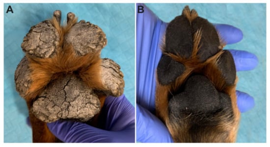 Clinical phenotype at six months of age. (A) Marked expansion of the footpads by thick projections of dense keratin in the affected Rottweiler. The adjacent haired skin appears unaffected on this image. (B) Footpads of a normal six-month-old control Rottweiler.