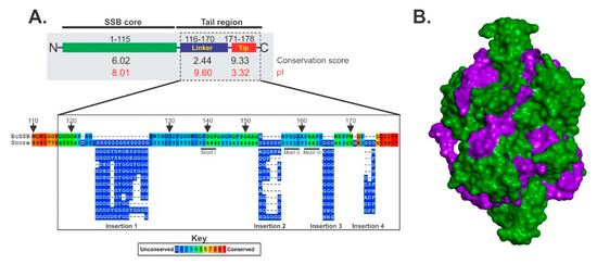 Organization of the SSB protein. (A), Schematic of SSB divided into the core and tail regions by proteolytic cleavage. The conservation scores for each region were calculated from alignments using Praline [61]. The pI of each region is shown in red and was calculated using the ProtParam tool of Expasy [62]. The pI of the intact protein is 5.44. (B), The SSB tetramer is intimately associated with ssDNA. The image was generated using PDB file 1EYG [58]. The DNA is colored purple and the tetramer, is colored green. Both protein and DNA are represented as Connolly surfaces.