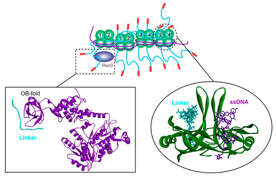 The linker/OB-foldnetwork of interactions is critical to SSB interactome function. Top, a schematic of an SSB-ssDNA complex demonstrating how the linker-OB-fold network of interactions produces a stable complex where the ssDNA is coated and protected. Here, the linker from the first tetramers bind to the OB-folds in adjacent tetramers, while other linkers are exposed and available for partner binding, in this case, RecG (left inset). Here, the helicase is presented as a ribbon diagram (purple) and a linker domain (cyan) is modeled into the OB-fold. When SSB-tetramers interact, some OB-folds are occupied by linker domains (cyan) while others bind ssDNA (purple). For clarity, only two monomers of the tetramer are shown and represented as ribbon diagrams (colored green). The schematic is adapted from [63].