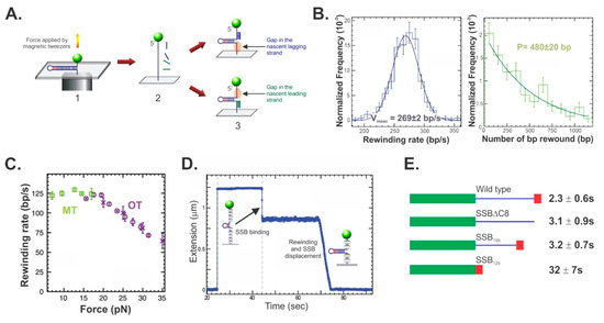 Single-molecule studies using magnetic tweezers revealed that this enzyme is the RecG DNA helicase [24]. Using a 1200 bp hairpin, RecG was shown to rewind complementary fork arms; to couple DNA unwinding to this rewinding and to generate Holliday junctions in the process (Figure 8). Importantly, RecG catalyzed fork regression only. During the coupled unwinding/rewinding reaction, that is fork regression, movement of the fork proceeded at a rate of 269 ± 2 bp/sec and with a processivity of 480 ± 20 bp. As RecG utilizes 1 ATP to translocate 3 bp, 160 nucleoside triphosphate molecules are hydrolyzed on average per fork regression event [35,133]. By using a combination of both magnetic and optical tweezers, the authors demonstrated that RecG could catalyze rewinding against forces of up to 35 pN, with only a moderate drop of about 40% in rate (Figure 8C). This is consistent with RecG being a very powerful motor that should be able to clear the fork of bound proteins. This was tested using SSB, which requires at a minimum, 10 pN of force per tetramer [134]. Not surprisingly, the protein posed little threat to RecG as the enzyme was capable of coupling rewinding to efficient SSB displacement (Figure 8D). Subsequent studies determined that the SSB linker is required for efficient displacement as mutant SSBs with the linker either partially or completely deleted, significantly impaired the ability of RecG to displace them (Figure 8E). This does not require linker/OB-fold interactions as the RecG OB-fold is already bound to the fork. Instead, this reflects the ability of RecG to push SSB off the DNA. When linker/OB-fold, SSB–SSB interactions were in play as they were for the wild type and SSBΔC8, the pushing by RecG was communicated between the SSB tetramers facilitating displacement. In contrast, when SSB–SSB linker/OB-fold interactions were absent, the SSB125 tetramers, which have no linker, functioned as separate, tightly bound entities that impede RecG translocation.