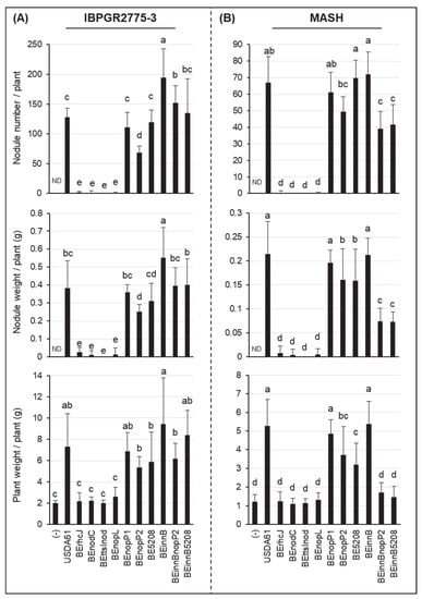 Symbiotic properties of Vigna mungo cv. IBPGR2775-3 (A) and MASH (B) inoculated with B. elkanii strains. The data shown are the means of 20 to 30 from five or six independent inoculation assays at 35 dpi. The error bars indicate standard deviations. Means followed by different letters are significantly different at the 5% level (p ≤ 0.05 by Tukey’s tests). ND, not detected.