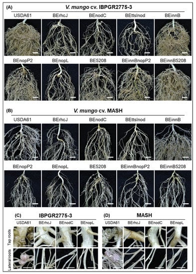 Roots of V. mungo cv. IBPGR2775-3 (A) and MASH (B) inoculated with the B. elkanii strains at 35 dpi. Nodulation properties IBPGR2775-3 (C) and MASH (D). Scale bars: 1 cm for (A,B) and 0.25 cm for (C,D).