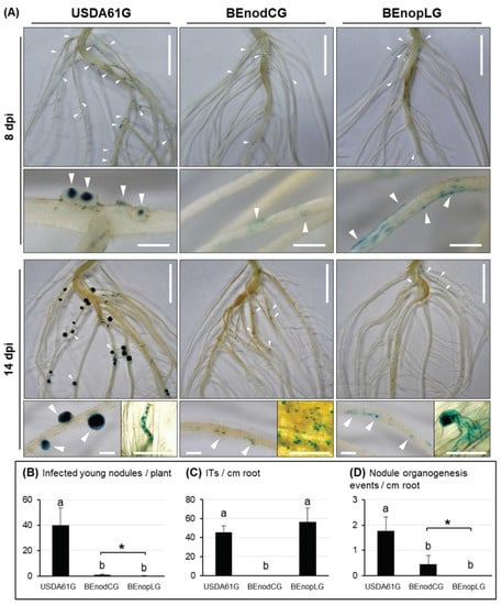 The GUS-tagged B. elkanii strains were constructed by chromosomal integration of the plasmids pCAM120 [22] via conjugations. Single colonies of the constructed mutants were verified by antibiotic resistance, PCR, and GUS assays using X-Glc (Wako Pure Chemical Industries, Osaka, Japan) in dimethylformamide as a substrate. To avoid unexpected effects possibly caused by transposon random insertions, at least two different GUS-tagged mutants were used for inoculation assays. GUS staining and microscopic analysis were performed as described previously [23]. The basal regions of lateral roots were sampled (~1 cm) to observe infection threads (ITs) and nodule organogenesis events [9,21]. Microscopic observations were conducted under a stereoscopic microscope (BX43; Olympus Corporation, Tokyo, Japan).