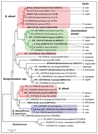 Phylogenetic analysis of B. elkanii USDA61 NopL and its homologs among rhizobia. Bootstrap values are expressed as percentages of 10,000 replications. The groups of B. elkanii (red), B. japonicum/B. diazoefficiens (blue), and Sinorhizobium/Ensifer (green) NopLs are highlighted. The Xanthomonas DNA polymerase III subunit γ/τ is used as an outgroup. The main hosts or hosts where rhizobial strains were first isolated are shown: A. americana, Aeschynomene americana; A. hypogaea, Arachis hypogaea (peanut); C. cajan, Cajanus cajan (pigeon pea); C. paraense, Centrolobium paraense; G. max, Glycine max (soybean); L. albus, Lupinus albus (lupin); L. carinata, Leobordea carinata (leptis); L. purpureus, Lablab purpureus; N. wightii, Neonotonia wightii (perennial soybean), P. erosus, Pachyrhizus erosus (jicama/Mexican yam bean); P. lunatus, Phaseolus lunatus (lima bean); S. officinarum, Saccharum officinarum (sugarcane); and V. unguiculata, Vigna unguiculata (cowpea).