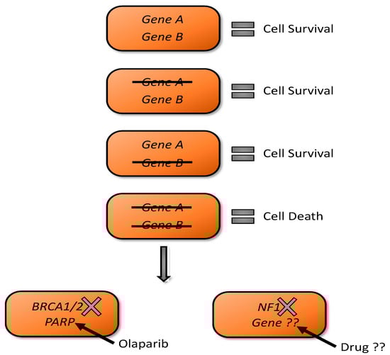 Synthetic lethality if the genetic incompatibility of the loss of two independent gene products results in cell death. Whereas a hypothetical cell can survive with either loss of Gene A or Gene B, it cannot live with loss of both simultaneously. A prime example of this being exploited therapeutically is in BRCA1/2 mutated cancers and their sensitivity to PARI inhibitors such as olaprarib. Similarly, loss of NF1 could render human Schwann cells sensitive to pharmacologic intervention with novel agents.