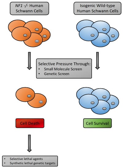 Screening scheme utilizing NF1-deficeint immortalized or iPSC derived human Schwann cells. NF1 −/− cells (of either origin) and their isogenic match parental lines can be used in selective lethal pharmacologic screens or synthetic lethal genetic screens. Compounds found to only kill NF1-deficient cells could be then prioritized for further preclinical testing, using in vivo models of MPNST for example. Novel genetic targets identified from genome-wide synthetic lethal genetic screens could provide the basis for additional drug discovery efforts.