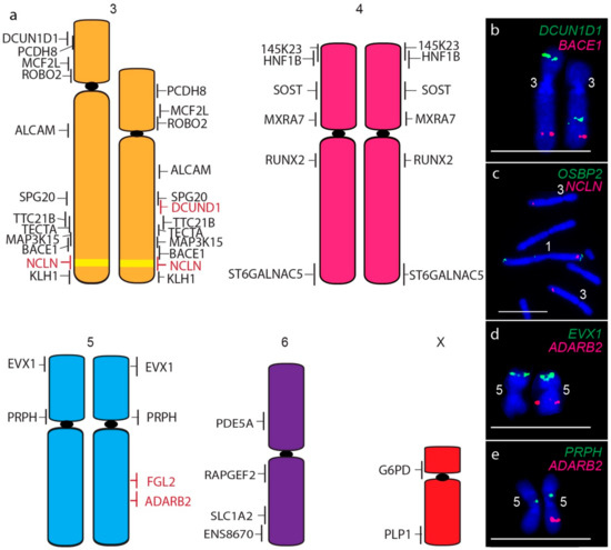 A consistent size difference between chromosome 3 homologues was also detected, as well as the translocation of the short arm gene DCUN1D1 to the long arm of chromosome 3 homologue (Figure 4a,b). In addition, the chromosome 1 gene NCLN is present not only on both copies of chromosome 1 but on both homologues of chromosome 3 (Figure 4c), a copy number gain not detected by sequence analysis. The only other difference between devil and DFT2 chromosomes was detected for one homologue of chromosome 5, which was missing copies of long arm genes FGL2 (Figure 4d) and ADARB2 (Figure 4e). These copy number losses were also detected by sequence analysis (Table S1) [7].