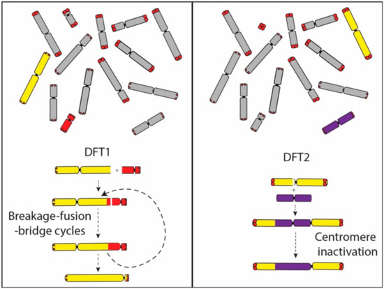 There are marked differences in chromosome rearrangements between DFT1 and DFT2, with DFT2 having undergone relatively simple rearrangements compared to DFT1 [7]. Both have a 2n = 13 karyotype, compared to the 2n = 14 karyotype for Tasmanian devils, yet are otherwise dissimilar. The major rearrangement proposed to have led to the highly rearranged DFT1 karyotype was the end-to-end fusion of one homologue of chromosome 1 to the maternal copy of the X chromosome. This fusion was most likely followed by a series of break–fusion–bridge cycles, which led to the distinctive DFT1 karyotype, where a homologue of chromosomes 1, 4, 5, and both copies of the X chromosome are unrecognisable due to extensive rearrangement [9,10,11]. In comparison, in DFT2 the most notable rearrangement is the translocation of a chromosome 6 homologue into a chromosome 1 homologue [7]. Minor karyotype differences within DFT1 have arisen over time, leading to at least four distinct karyotypic lineages [12]. No such lineages have yet been described for DFT2. Overall, the DFT2 karyotype is more visibly similar to the Tasmanian devil karyotype compared to DFT1.