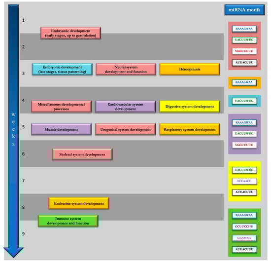 In particular, the analysis of the motifs contained in miRNAs (Supplemental File S1) allowed hypothesizing a possible implication of selected motifs in the regulation of specific developmental stages, according to a specific timeframe (Figure 2). In particular, for example, the miRNA sequence motifs RAAAGWAA, UACUUWUG, YGGUUUUU, and AUUACUUU apparently represent putative DNA-binding domains shared not only by TFs involved in the regulation of early developmental stages and morphogenetic events (‘Embryonic development, early stages up to gastrulation’ functional cluster), but also with those involved later events, such as neural, urogenital and skeletal system development or miscellaneous developmental processes (Figure 2). On the contrary, the late stages of embryonic development (‘Embryonic development, late stages, tissue patterning’) seemed to be specifically regulated by the RAAAGWAA motif (Figure 2). Hemopoiesis and endocrine and respiratory system development functions also appeared enriched among the GO terms for the RAAAGWAA motif, while UACUUWUG, ACCAACC, and AUUACUUU domains were found to be involved in the regulation of digestive system development and RAAAGWAA, UACUUWUG, and YGGUUUUU motifs were related to cardiovascular system and muscle development functions (Figure 2). In addition, our in silico analysis showed that RAAAGWAA, GCUUCCHU, GGAMAG, and AUUACUUU binding motifs could affect the expression of genes associated with immune system development and function (Figure 2).