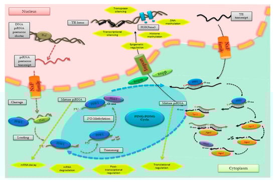 - Peng, J.C.; Lin, H. Beyond transposons: The epigenetic and somatic functions of the Piwi-piRNA mechanism. Curr. Opin. Cell Biol. 2013, 25, 190–194. [Google Scholar] [CrossRef] [PubMed]