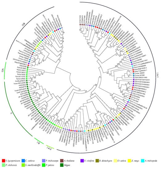 In order to analyze the phylogenetic relationship of plant MLO genes, 164 MLO genes with an intact domain (excessively short sequences were excluded) from 28 species were used to construct a phylogenetic tree (Figure 2). These genes could be divided into three groups. Group I contained 105 (64.0%) genes, which could be further divided into three subgroups (I A-1, I A-2, and I B). Sixty-five (79.3%) dicot genes, 25 (83.3%) monocot genes, 5 (71.4%) A. trichopoda genes, and 1 P. sitchensis gene were in I A-1, 4 (50%) S. moellendorffii genes were in I A-2, and 5 (45.5%) P. patens genes were in I B, respectively. Group II contained 24 genes, all from algae. Group III contained 35 genes, which could be further divided into two subgroups (III A and III B). Six (54.5%) P. patens genes and 1 algae gene were in III A, and 17 (20.7%) dicot genes, 5 (16.7%) monocot genes, 2 (28.6%) A. trichopoda genes, and 4 (50%) S. moellendorffii genes were in III B, respectively.