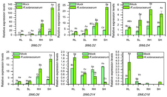 The relative expression levels of six SlMLO genes in resistant and susceptible tomato lines inoculated with R. solanacearum. R, resistant line; S, susceptible lines; L, leaf; H, whole seedling. Error bar indicates standard deviation. The uppercase and lowercase letters above the error bars indicate statistically significant differences (Tukey’s test, p < 0.01 and p < 0.05). The replication data of SlMLO16 expression analysis in whole seedlings were missed.