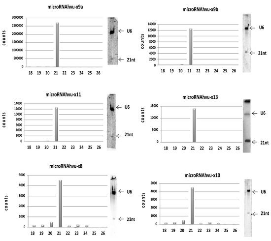 To identify novel barley microRNAs, we prepared small RNA libraries from five stages of barley development (1-, 2-, 3-, and 6-week-old and 68-day-old plants) and performed Illumina sequencing. After the sequencing reaction, we were able to obtain more than 15 million unique, quality-filtered and adapter-trimmed reads. The BLASTn program [36] was used to align reads from our libraries to known microRNAs, and the data were further processed as described in [33]. We confirmed the presence of putative microRNAs and found that generally during the barley development, miR168-3p and miR1432-5p levels increase while the 5′U-miR156-5p level decreases (with exception for the 2-week-old barley) [32]. In our data, 21-nt long reads were the dominant fraction of the newly identified microRNA sequences (Figure 2, left panel). Presence of novel microRNAs was confirmed with Northern hybridization (Figure 2, right panel). In the case of one predicted microRNA (hvu-x13) that is expressed at very low level, it was necessary to apply a modified Northern approach—higher amount of RNA and a chemical crosslinking of RNA to the membrane [35]. Ultimately, we identified 6 novel microRNAs that we termed microRNAhvu-x9a, microRNAhvu-x9b, microRNAhvu-x11, microRNAhvu-13, microRNAhvu-x8 and microRNAhvu-x10. Analysis revealed that microRNAhvu-x9a and -x9b represent a family due to sequence similarities and have a common target gene. Moreover, microRNAhvu-x11 is a homologue of the microRNA tae-miR9662b-3p previously reported in Triticum aestivum [37].