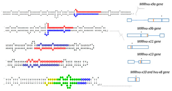 Schematic representation of identified novel miRNA precursors and their MIR genes. Left panel presents pre-miRNA hairpin structures of novel miRNAs. Red color indicates sequence of microRNA, the blue color indicates its corresponding microRNA*. In the case of microRNAhvu-x8 and microRNAhvu-x10 that are processed from the same precursor (microRNAhvu-x10 from 5′ arm and microRNA, hvu-x8 from 3′ arm) mature miRNAs are depicted in yellow color and miRNAs* in blue, green color indicates common nucleotides for those microRNAs and their microRNA*. Right panel shows novel MIR gene structures. White boxes represent exons while connecting thin lines indicate intronic sequences (1 cm corresponds to 100 bp). The red bar represents position of microRNA while blue bar represents position of microRNA*. Pre-miRNAs for miRNAhvu-x9a, -9b and miRNAhvu-x10 and -8 are very long. Dots in brackets represent sequence in the middle of hairpin structure that due to the length cannot be presented on the graph (full sequences are shown in Supplementary data).