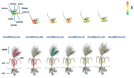 MicroRNAhvu-x11, hvu-x8, hvu-x10 and hvu-x13 were expressed at low levels throughout the plant but were highly accumulated in particular flower organs. MicroRNAhvu-x11 accumulated in the caryopses, while microRNAhvu-x10 and hvu-x8 exhibited high levels in the lodicules. MicroRNAhvu-x13 was characterized by high expression in the lodicules, rachises and roots. Another microRNA, hvu-x9b, was characterized by moderate expression throughout the plant and accumulated in the lemmas, while miRNAhvu-x9a was expressed at high levels in organs such as the leaves or spikes but was poorly expressed in flower organs (Figure 5). Taken together, these results suggest the involvement of these microRNAs in the development and function of flower organs and indicate a further direction of study.