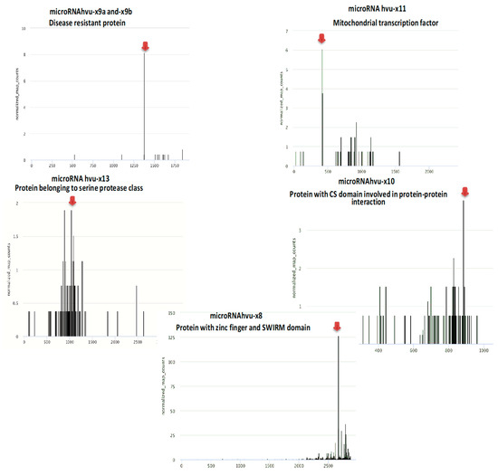 Target plots (T plots) for target mRNAs of novel barley microRNAs. The x-axis on the graphs represents the length of the targeted mRNA, y-axis shows normalized number of reads. Names of novel barley miRNAs and information about their targets are provided above the graphs. Red arrows indicate the position of the predicted cleavage site in particular mRNA.