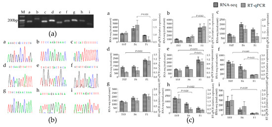 Validation of back-site and RNA-seq of circRNAs: (a) divergent primers amplify circRNAs in cDNA. (b) Sanger sequencing experimental validation the back-splicing site sequence of circRNA. (c) RT-qPCR validation of 9 differentially expressed circRNAs in three groups. SYF: small yellow follicle, F6: smallest hierarchical follicle, F1: largest hierarchical follicle. T: theca cell. Graph numbers of a, b, c, d, e, f, g, h, and i represent circRNAs chr2:75502|78826, chr23:5380525|5384728, chr4:49990652|50010410, chr3:31294378|31311114, chr2:47799748|47802307, chr3:40478181|40486533, chr3:76644181|76644976, chr8:6369673|6402248, and chr8:6369673|6422097, respectively.