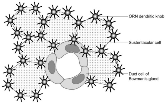 In spite of these and other works, up to the present day it is still generally believed that an overwhelming majority of ORN dendrites in the OE are located between OSCs [29,30] (Figure 2), and the wrapping of ORN dendrites by OSCs, if recognized at all, has been characterized as occasional and partial [31,32,33,34].