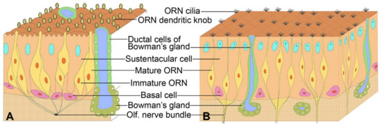 Schematic illustrations of the olfactory epithelium cytology as described in some of the recent publications [29,30]. Both illustrations clearly assumed olfactory receptor neuron (ORN) dendrite positions between olfactory sustentacular cells (OSCs). (A) Re-drawn and modified with permits from [29] and (B) re-drawn from [30] with permits.