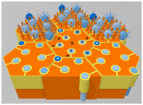 A three-dimensional diagram to show the rat olfactory epithelium (OE) apical layer. Six and a half OSCs (S, orange) and related ORN dendrites are shown, three with intact OSC microvilli, related dendritic knobs, and cilia (top row), and the rest having the OSC microvilli and related dendritic knobs removed to better illustrate relations among the cells. Newly emerged ORN dendrites are immature (highly immunoreactive for class-III β-tubulin) and located at the borderlines between OSC apices (unwrapped, three of them being labeled by “u” in white). Along the course of further maturation (as marked by progressively weakening class-III β-tubulin immunoreactivity), most of the dendrites undergo sideways migration and become enwrapped (“e”) by OSCs, but a few remain unwrapped upon maturity (one being labeled by ‘u’ in black). Partially-wrapped ORN dendrites (one labeled by “p”) may represent intermediate stages from unwrapped immature to enwrapped mature status. The apical junctional complex (yellow) can be distinguished into those homotypic cell–cell junctions between OSCs, heterotypic junctions between OSCs and ORN dendrites, and autotypic junctions that link neighboring pleats or folds of the same OSC, and form the mesenteries of enwrapped dendrites (mesodendrites, arrowheads). Modified with permits from [11].