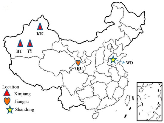 Map of China showing the sampling locations of the five Chinese local sheep breeds analyzed in this study.