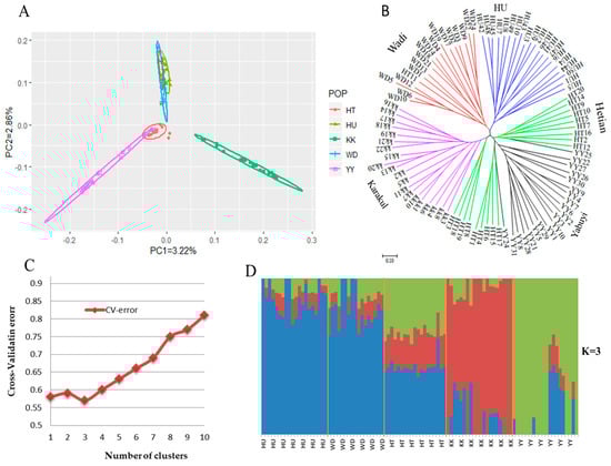Population relationship and structure analyses of the five Chinese local sheep breeds from extremely dry (HT, YY, and KK) and humid (WD and HU sheep) environments. (A) Principal component (PC) analysis among the 96 sheep of the five breeds. (B) Maximum-likelihood tree reconstructed using the RAxML with the GTRGAMMA model followed by a correction for ascertainment bias. (C) Cross-validation errors across the 10 assumed ancestral genetic clusters among the five breeds. (D) Genome-wide admixture proportions at K = 3 among the 96 sheep of the five breeds.
