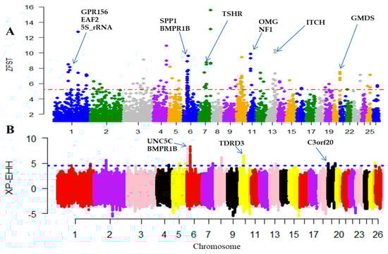 Manhattan plots of genome-wide autosomal Z(FST) (A) and XP-EHH (B) analyses for the comparison between the short tailed (Yabuyi sheep) and long fat-tailed (Karakul sheep) breeds.