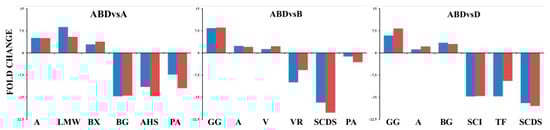 Validation of differentially expressed genes (DEGs) (blue—qPCR; red—RNAseq) in three respective comparisons (GG—gamma gliadin-B, A—avenin, V—vicilin, VR—vestitone reductase, SCDS—syn-copalyl diphosphate synthase, PA—profilin A, LMW—low molecular weight glutenin, BX—beta-D-xylosidase 4, AHS—alpha humulene synthase, SCI-—subtilisin chemotrypsin inhibitor, TF—transcription factor MyC2, BG-Beta glucosidases).